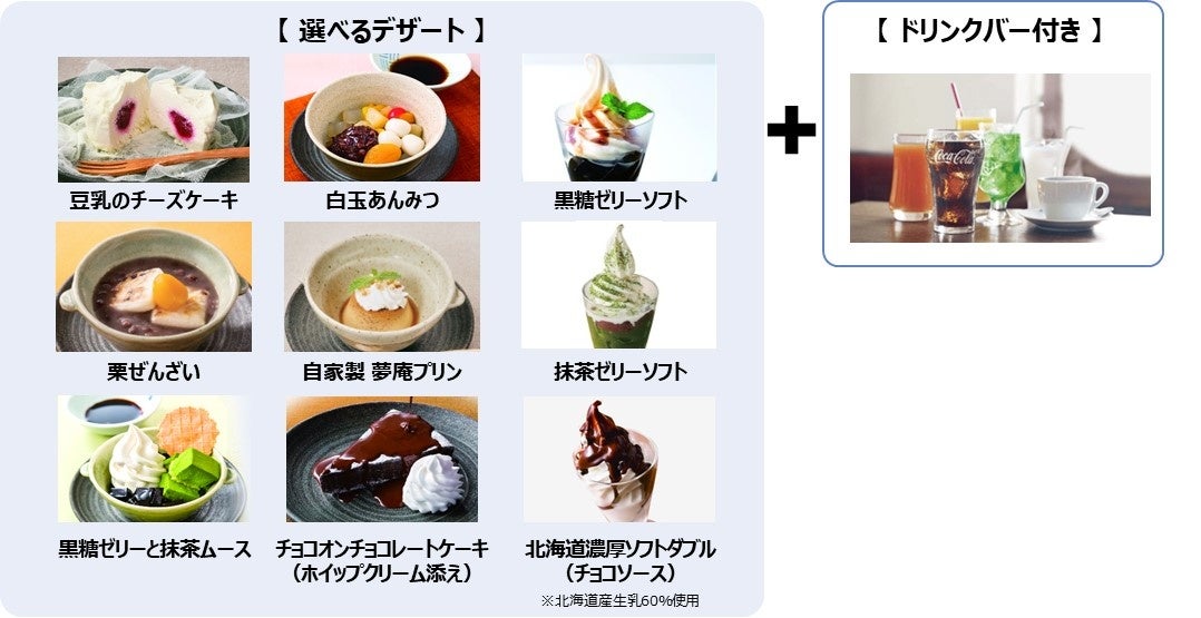 ※2 通常価格で税込549円のデザート(白玉あんみつ、栗ぜんざい、黒糖ゼリーと抹茶ムース、チョコオンチョコレートケーキ)とセットドリンクバー(ランチタイム以外)を注文した場合、税込価格で563円お得になります