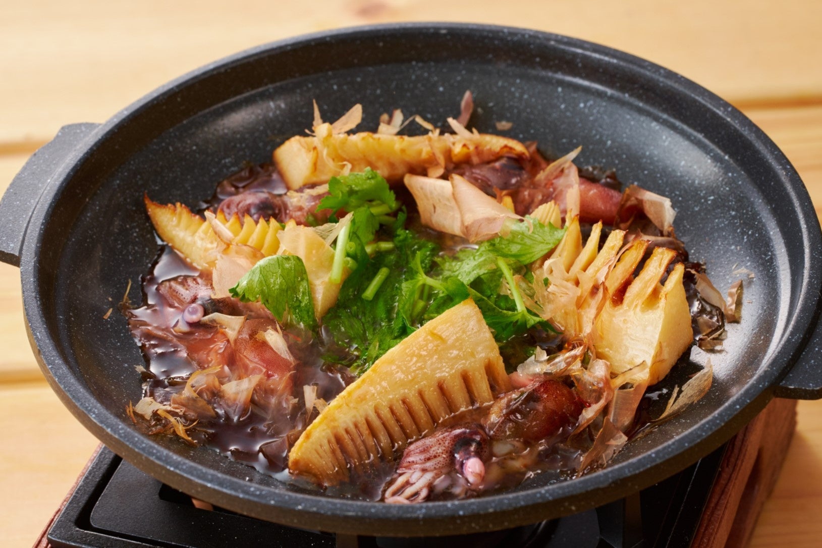 竹の子の風味と、 “富山県産ほたるいか”の旨味が陶板の上で合わさった、相性抜群の一品。