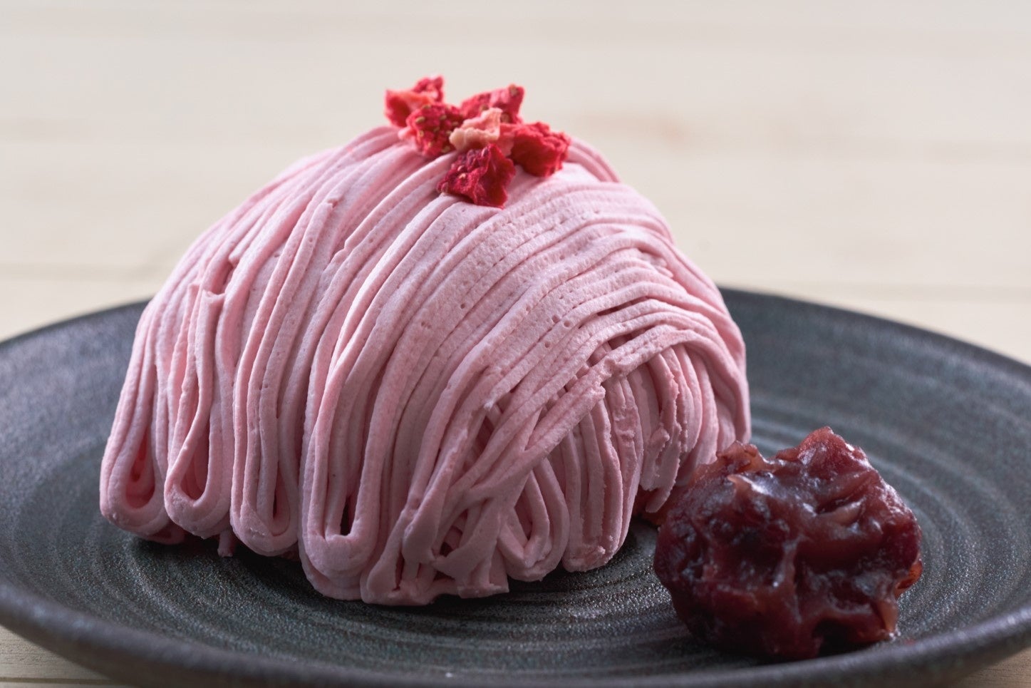 いちごのシフォン生地に、甘酸っぱいいちごフィリング・和三盆入りホイップクリーム(※) ・白あんいちごクリーム・ドライいちごを乗せたモンブランに、十勝産小豆を使用した小倉あんを添えた、夢庵の自信作です。