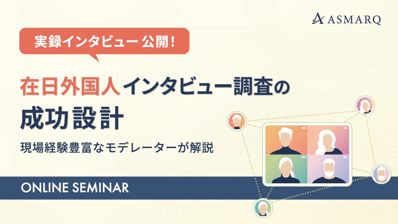 株式会社アスマーク(東京都渋谷区東、代表取締役:町田正一)は、2025年06月11日(水)13:00に、「在日外国人調査」をテーマに、グループインタビューの実録映像を公開しながら、調査設計からインタビューの進行、結果の活用方法までをオンラインセミナーで紹介いたします。