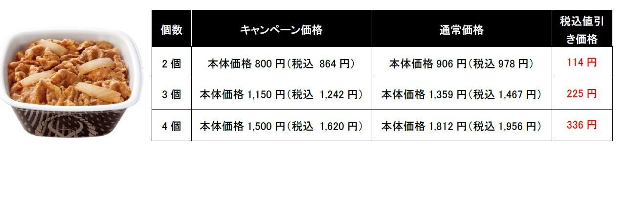 内容:テイクアウトの牛丼並盛を2個、3個、4個購入時にキャンペーン価格で提供します。