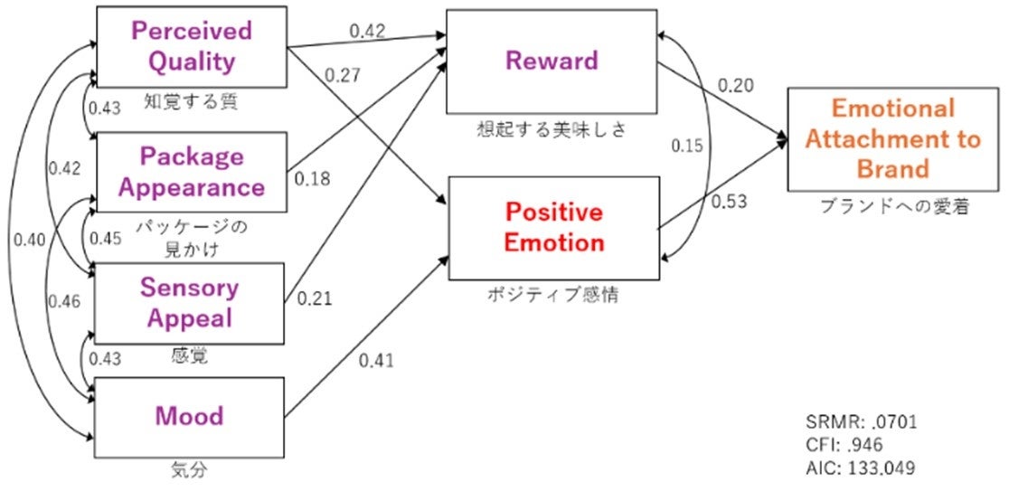 現行パッケージと新パッケージの共通点として、消費者のポジティブな反応を引き出すために重要な5つの要素が確認されました。それは、「品質の高さや信頼感(Perceived Quality)」、「見た目の良さ(Package Appearance)」、「五感に訴える魅力(Sensory Appeal)」、「感情に訴える魅力(Mood)」、「おいしさの想起(Reward)」です。さらに、新パッケージにはTeaseが含まれており、これが商品の価値観を損なうことなく、「親しみやすさ(Familiarity)」を有意に少しだけ向上させ、「新奇性(Novelty)」も少し向上させる傾向があることが分かりました。