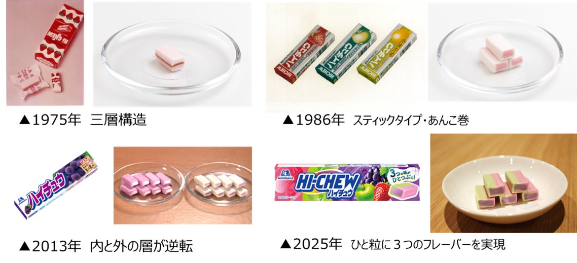 創業者の森永太一郎がアメリカで学んだキャラメルから発展し、1975年に誕生したのが「ハイチュウ」です。最初の「ハイチュウ」はソフトな食感とフルーツのおいしさをあわせた大人向けのお菓子として誕生しました。当時は箱入りで、粒は上下が白く真ん中にフルーツ色のキャンディを挟んだ3層構造でした。その後1986年に7粒入りの便利なスティックパックに、粒は”果汁本来の美味しさ、本物のフルーツを食べている時のような味”の変化を表現するため、外側と内側の二重構造の「あんこ巻き」になりました。外側はフレッシュ感や香りを重視した味わい、内側は果汁そのものの味わいを重視して仕上げており、外側と内側が口の中で融合することで、本物のフルーツを食べているようなフレッシュな味わいを表現しています。2013年には中と外の層を逆転させ、濃厚なフルーツの味わい層を外側にすることで、噛み出しから広がるフルーツ感が強化されました。そしてこの度発売する「ハイチュウ<王道ミックス>」は、原料と配合バランス、練り上げ時間や温度など綿密に調整する必要がある層に2種類の異なるフレーバーを組み合わせることに成功し、ひと粒に3つのフレーバーを入れることが実現いたしました。これからも「ハイチュウ」は進化を続け、驚きと楽しさをご提供してまいります。