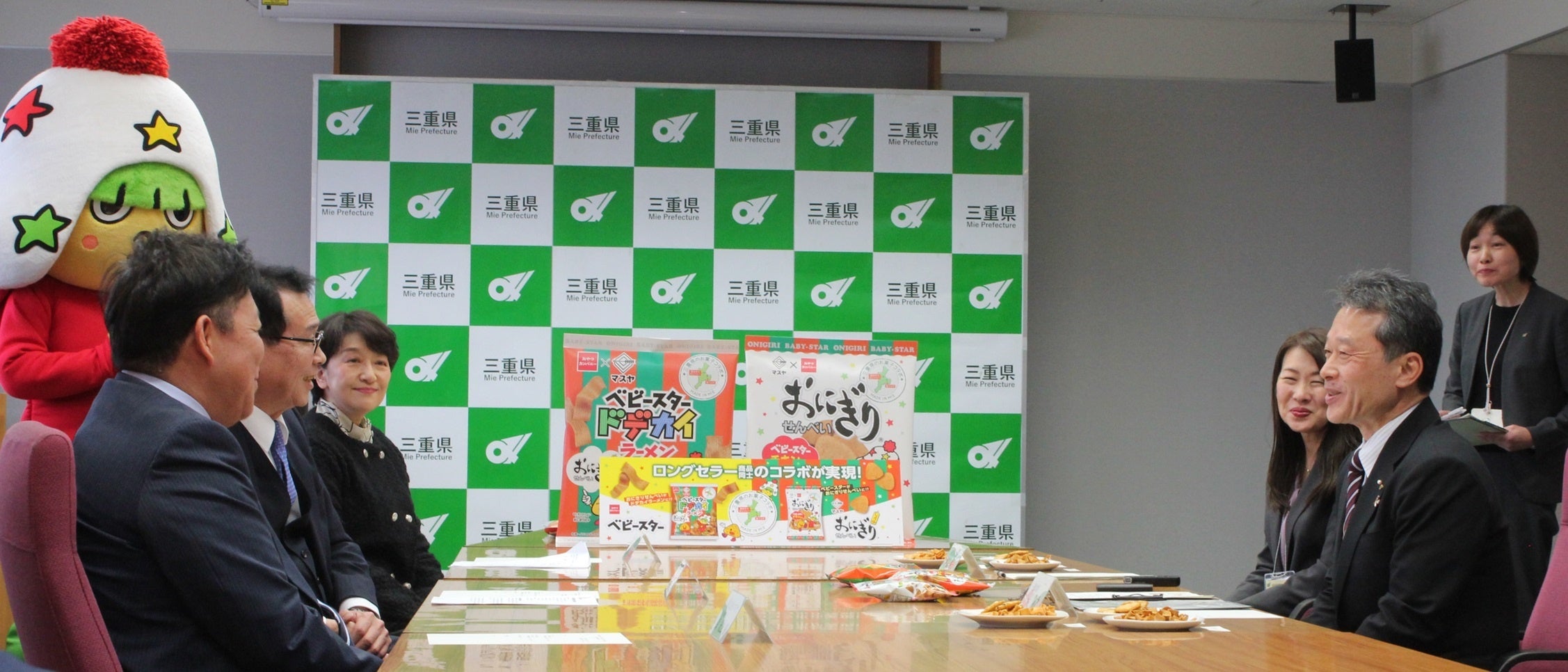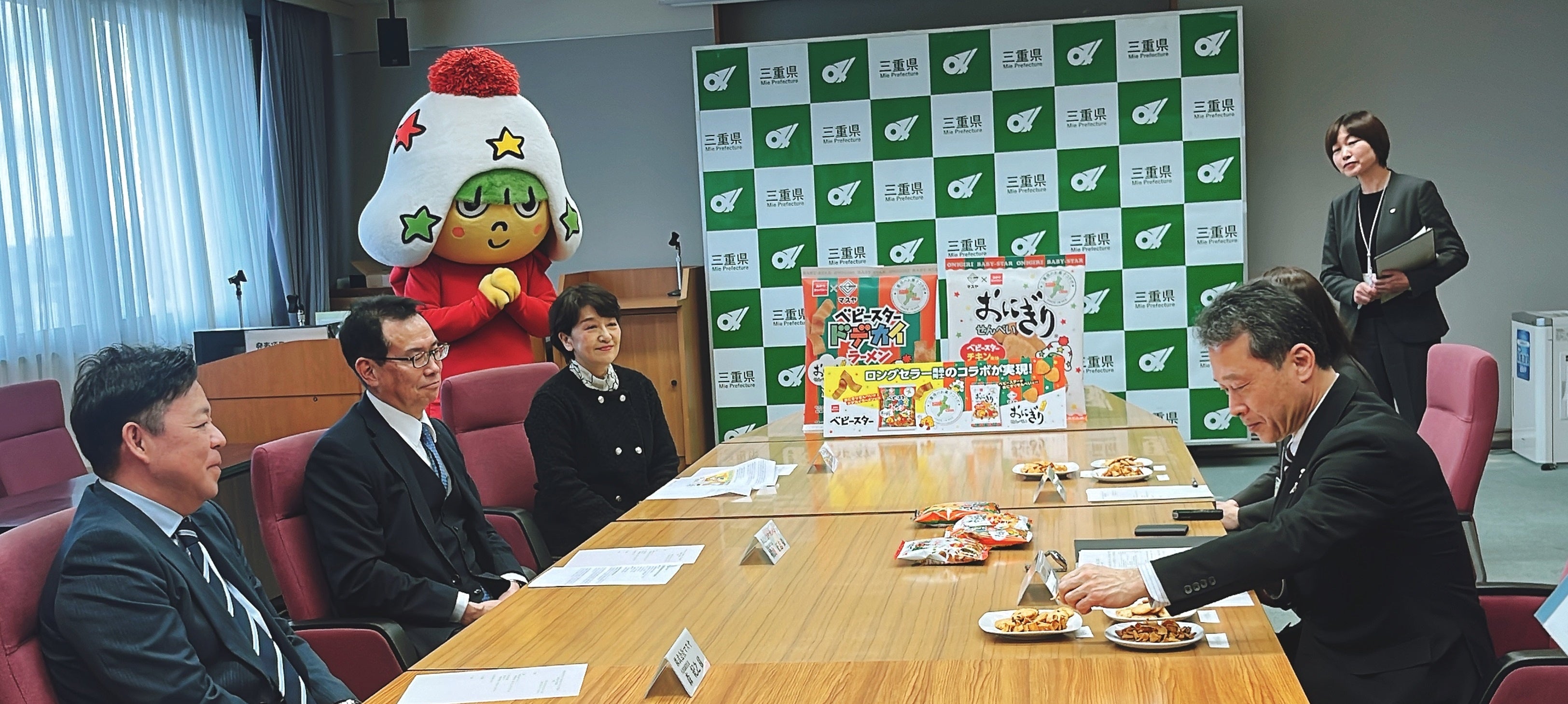 三重県のお菓子メーカーがタッグを組んで誕生した入れ替わりコラボ商品の発売にあたり、2025年2月20日(木)には、両社代表が三重県庁へ一見勝之知事を表敬訪問し、一見知事からは「子どもの頃から、ベビースターラーメンさんも、おにぎりせんべいさんも、三重県のものだと知らずに食べていた。既に全国区でご活躍いただいている両社が、(コラボ商品をきっかけに)三重県をさらに推していただけることに感激している。三重県としても最大限協力していきたい。」とのコメントをいただきました。