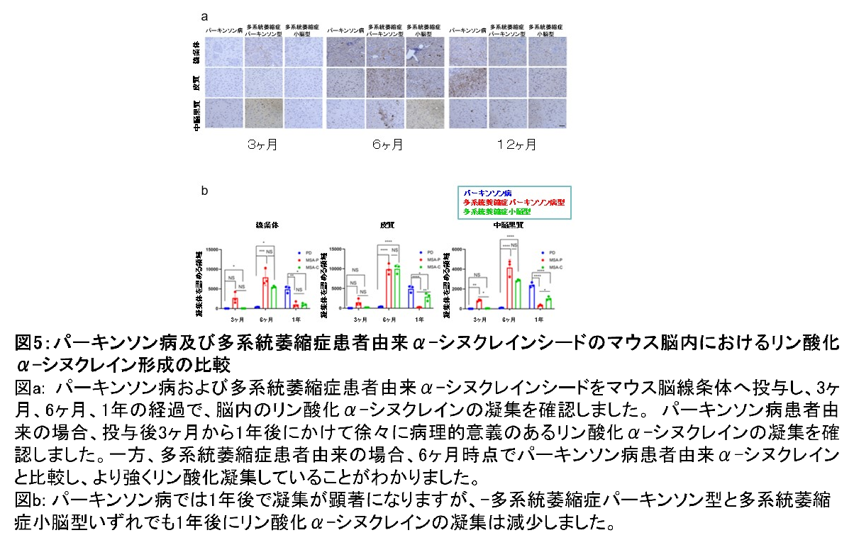 また、患者血清由来のα-シヌクレインシードを野生型マウスの線条体に投与し、α-シヌクレインシードの伝播と凝集について観察しました。パーキンソン病患者由来のα-シヌクレインシードを投与した場合、投与後3ヶ月から1年後にかけて徐々に病理的に異常なリン酸化α-シヌクレインの凝集体を確認しました。一方で、多系統萎縮症患者由来のα-シヌクレインシードを投与した場合では、6ヶ月時点でパーキンソン病患者由来のものと比較して、より多くリン酸化凝集体が蓄積していることがわかりました。さらに多系統萎縮症患者由来のものでは、投与の1年後にはリン酸化α-シヌクレインの凝集体は減少し、オリゴデンドロサイト(*8)の顕著な脱落が観察され患者脳で見られる病理と類似していました(図5)。以上のことから、患者血清由来のα-シヌクレインシードは、各α-シヌクレイノパチーの病態を形成する性質を有していることが示唆されました。