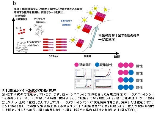 パーキンソン病(*1)やレビー小体型認知症(*2)、パーキンソン症候群(*3)である多系統萎縮症(*4)では、脳及び全身にα-シヌクレイン(*5)というタンパク質の凝集体が病的に出現し神経細胞死を引き起こすことが知られています。これらの疾患は、凝集しやすい異常構造型α-シヌクレインが脳に蓄積し神経細胞が脱落する疾患で、α-シヌクレイノパチー(*6)と総称されます。α-シヌクレイノパチーはふるえ、こわばり、動きが鈍くなるといったパーキンソン症状、認知症、自律神経機能障害、睡眠障害など多彩な症状を伴う進行性の難病ですが、現在の治療法は対症療法のみであり根治療法の開発が求められています。最近の研究で、この疾患は脳だけではなく全身の末梢神経にα-シヌクレインが蓄積することが明らかとなっており、研究グループは「全身への病気の広がりに血液を介した経路が関与している可能性がある」という仮説を立てました。そこで患者さんの血清から、α-シヌクレインシードを免疫沈降法 (IP)(*7)により濃縮し、凝集しやすい異常構造タンパク質をreal-time quaking-induced conversion(RT-QuIC)法で増幅することにより、極微量のα-シヌクレインシードを容易に検出するIP/RT-QuIC法を開発しました(図1)。この方法を用いて、α-シヌクレイノパチーの診断や鑑別、さらには病態解明のために、患者さんの大規模なスクリーニングを実施しました。