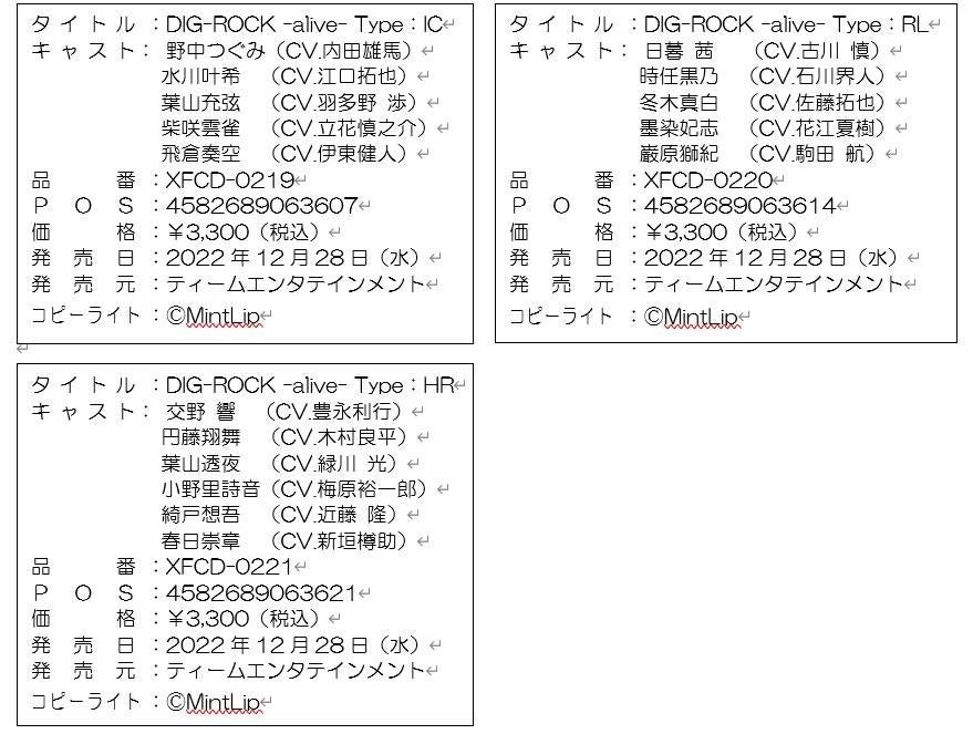 当社グループでは、保有IPのクロスメディア展開を幅広く進めてまいりましたが、この度、当社グループのオリジナルドラマCDタイトル『DIG-ROCK』におきまして、最新作となる『DIG-ROCK -alive-』の3種類のドラマCDを2022年12月28日(水)に同時発売いたします。
