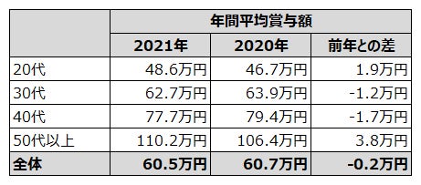 2021年1月~12月までに「クリーデンス」に登録した人の平均年間賞与額は、60.5万円でした。2020年は60.7万円だったことからほぼ横ばいで推移していると言えます。また、年代別でみると、若手層とベテラン層の平均年間賞与額が増加しています。