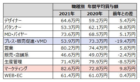 50代以上の平均年間賞与額が上がった背景には、「MD・バイヤー」「営業・店舗開発」で経験・知識そして人脈が豊富なベテラン人材を求める企業が増加したことが挙げられます。