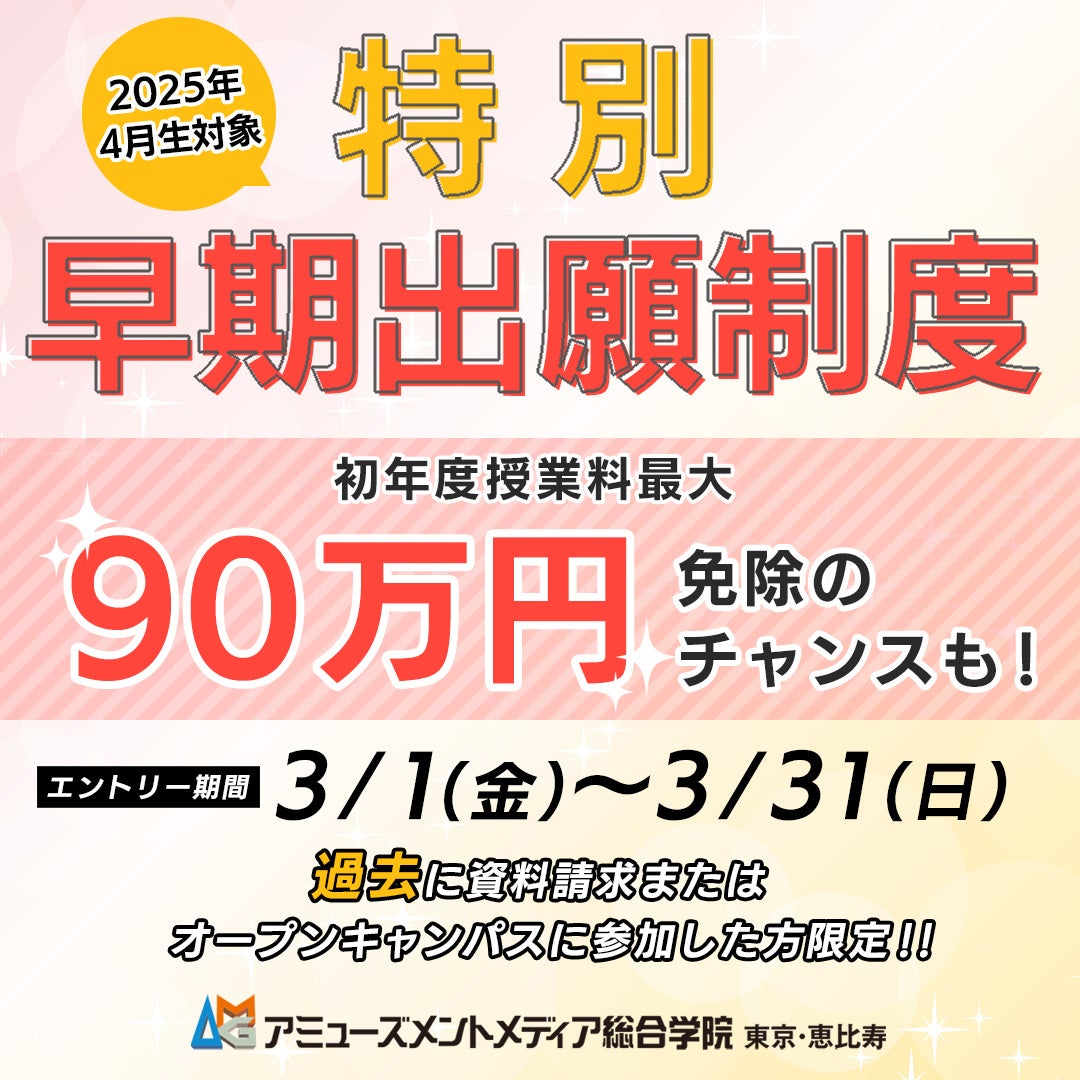 エンタメ業界のプロを育成するアミューズメントメディア総合学院(東京都渋谷区、理事長:吉田 尚剛、以下AMG)は、2024年3月1日(金)~3月31日(日)の期間、2025年4月入学対象の特別早期出願制度のエントリーを開始したことをお知らせします。