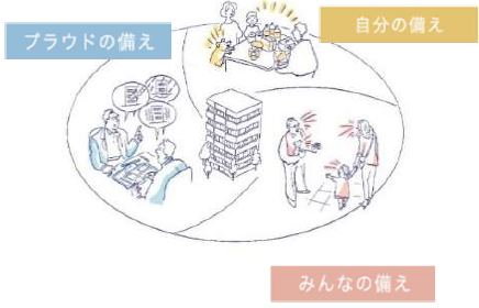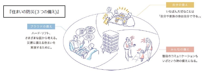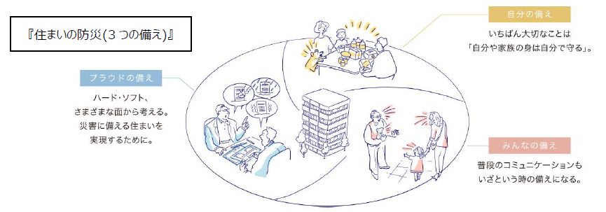 “3つの備え”は、建物の計画時からお客様入居後の暮らしまでを視野に入れ、ハード・ソフト両面から、自助・共助を促す仕組みを取り入れた、「自分の備え」「みんなの備え」「プラウドの備え」の考え方 が基軸となっている。