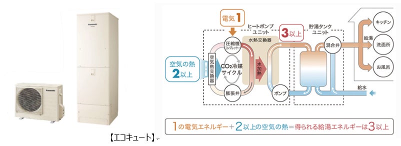 大気の熱を利用して、効率よく沸き上げ、CO₂排出量を抑えることが可能。