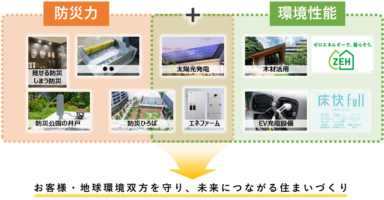 日本は、地形や地理、気象等の特性から自然災害リスクが非常に高い国とされており、当社ではお住まいになるお客様の安全な生活を第一に「住まいの防災」というコンセプトを掲げ、取組みを進化させてきました。しかし、気候変動に起因した自然災害は年々増加傾向にあり、今後はこれまで以上に、今の時代に必要な「防災力」を高めるととともに、未来の地球環境の保全につながる「環境性能」の双方を高めることで、今の暮らしと未来の暮らし、どちらも守る住まいづくりを積極的に展開していきます。