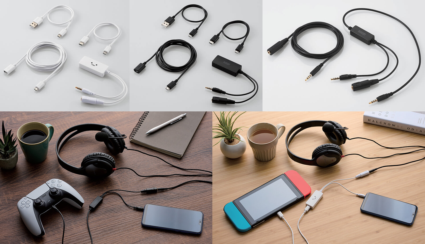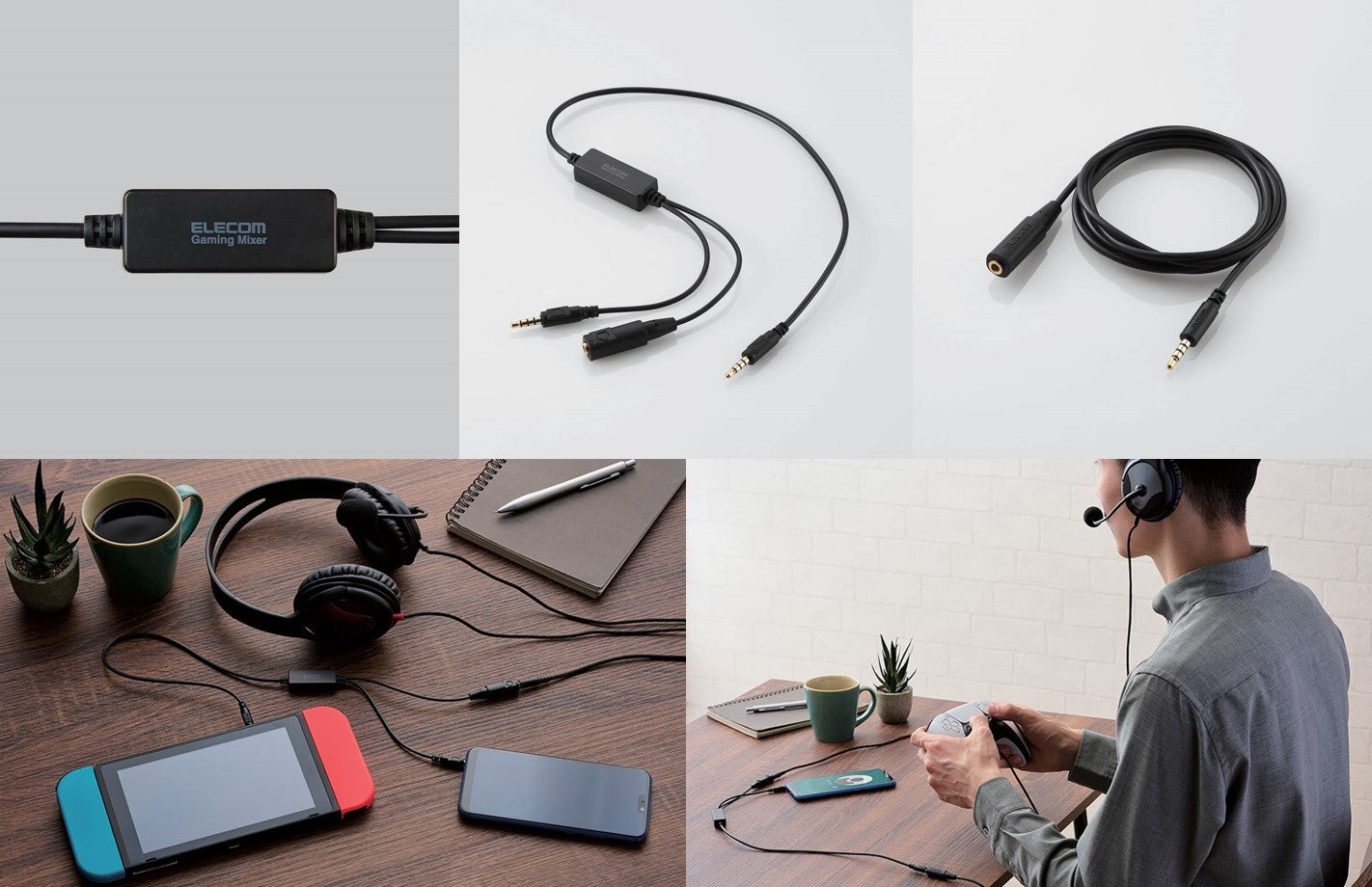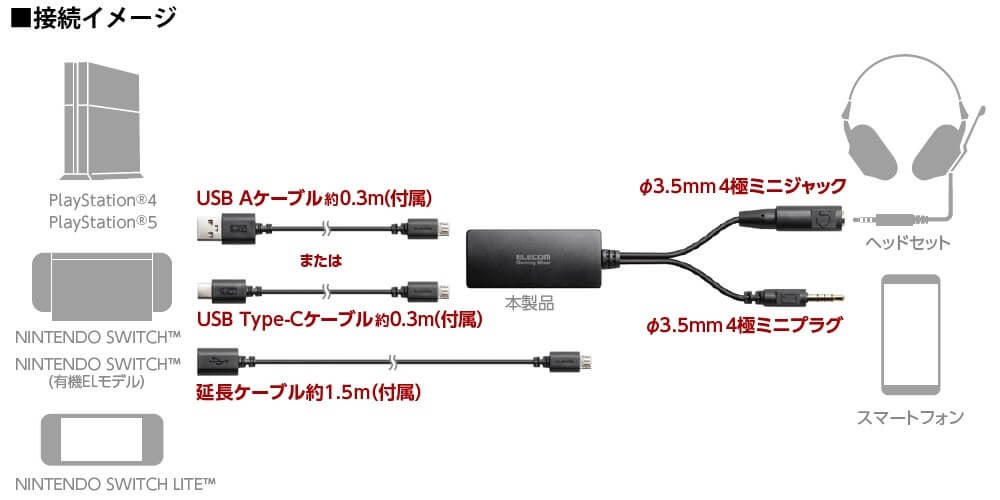 どちらのタイプも、接続に必要なケーブルが装備または付属するほか、本製品とゲーム機の距離を伸ばせる延長ケーブルも付属しています。ゲームサウンドを聴きながら、同時にスマートフォンで会話が楽しめる本製品をぜひご活用ください。