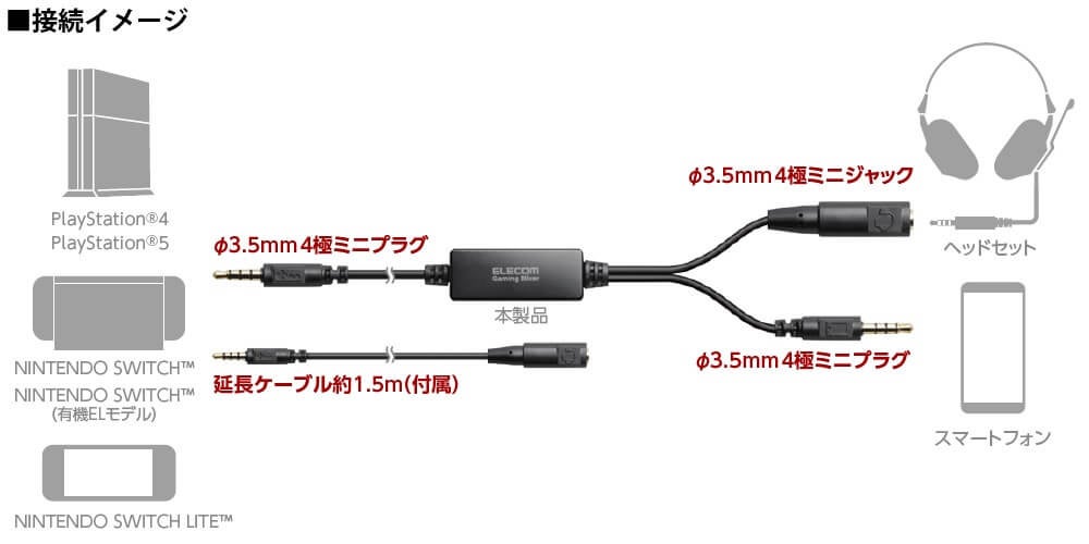 本製品にゲーム機とスマートフォン、マイク付きステレオヘッドセット(直径3.5mmミニプラグ仕様)を差し込むだけで使用可能です。