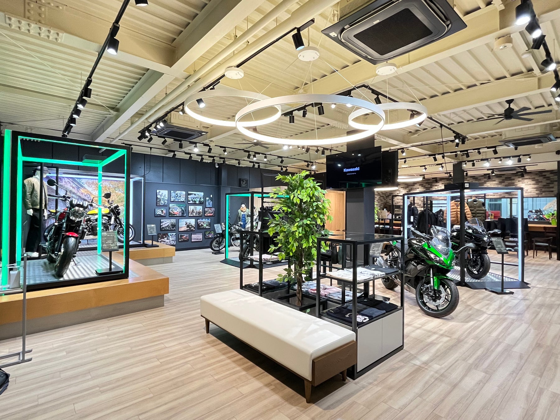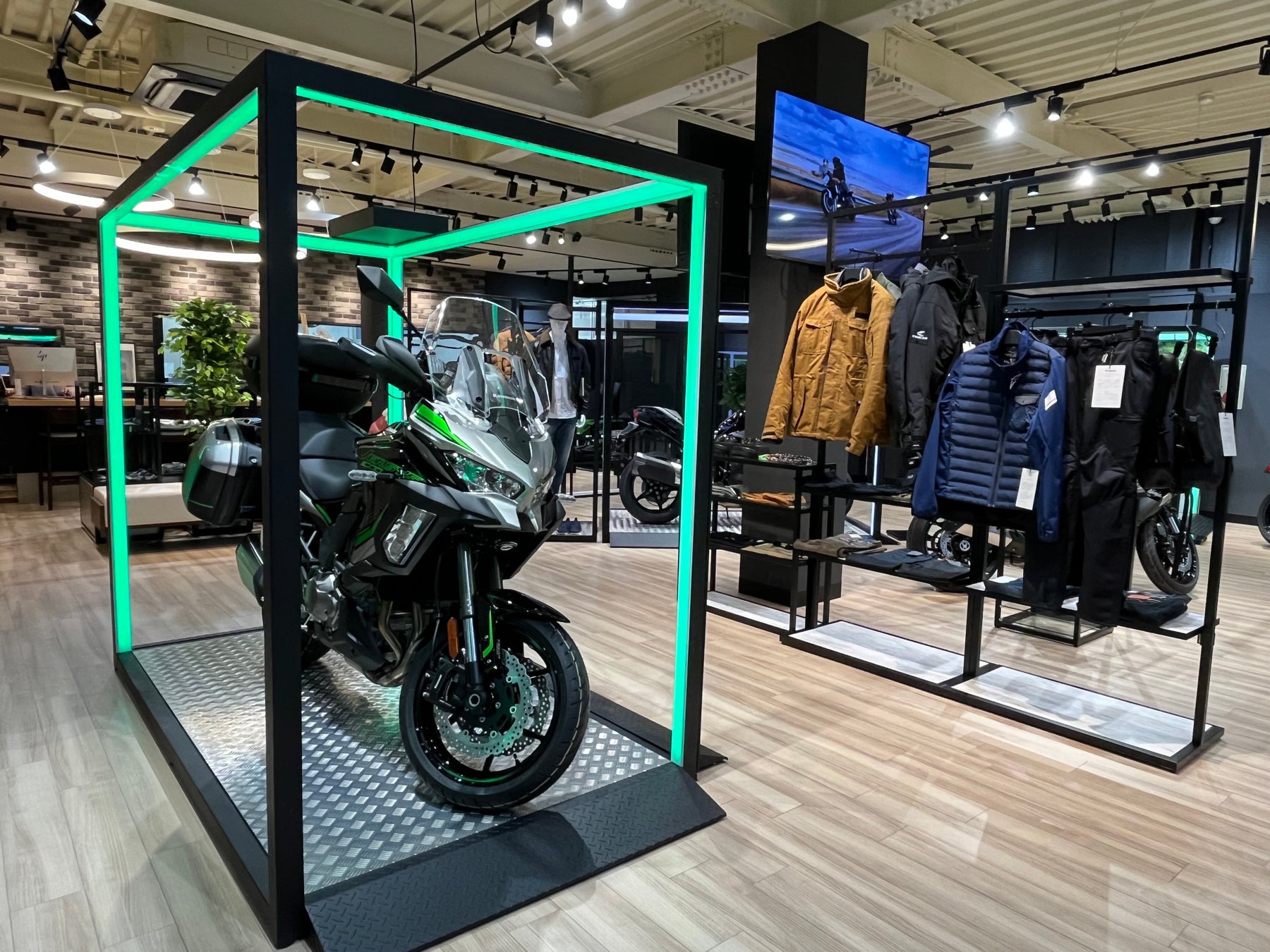 白を基調とした明るい店内へリニューアルした「カワサキ プラザ神戸垂水」は、新たなモーターサイクルライフをご提案いたします。