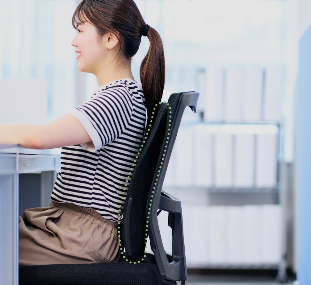 従来のもみ玉が上下するマッサージャーは、体重に負けないように頑丈で厚みのある支えをつけないといけませんでしたが、もみ玉に特殊加工をすることで、本体内部のパーツを減らし、8cmの薄さを実現しました。オフィスチェアに使っても背中に違和感なくなじみます。また、本体フレームに柔らかい素材を使用しているので、身体に柔らかくフィットします。