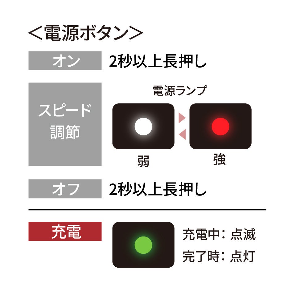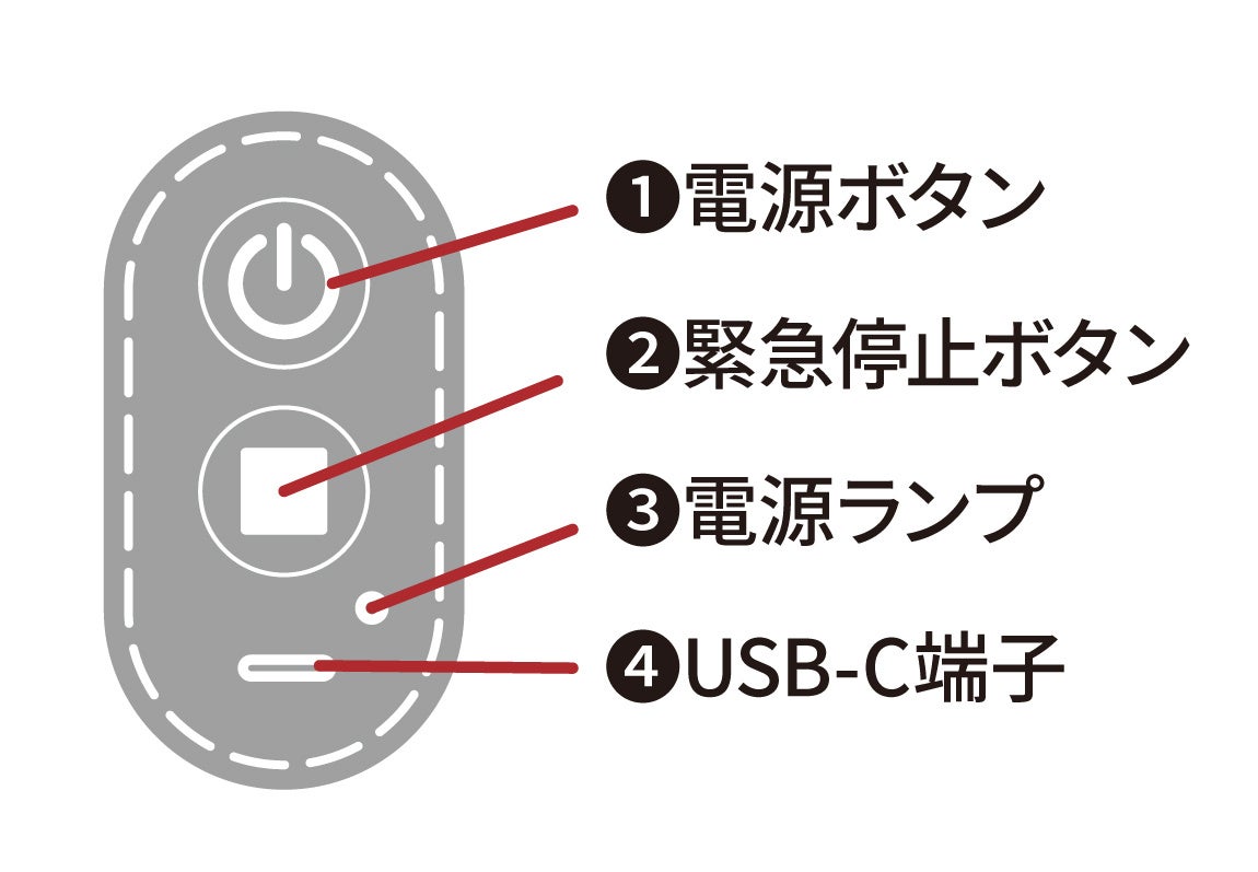 ボタンは電源ボタンと緊急停止ボタンの2つだけで、電源ボタンを長押しするだけで電源オン・弱、強、電源オフと操作ができます。
