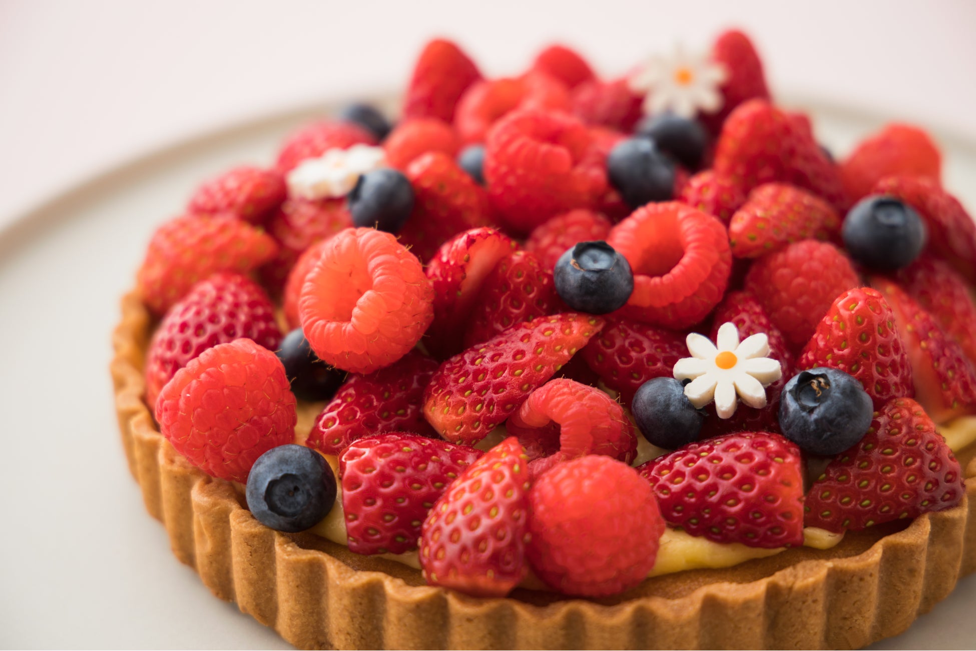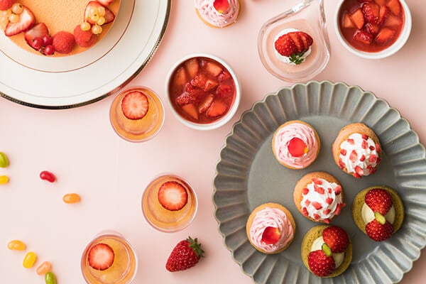 苺をたっぷりと乗せた人気のタルトや、苺ジュレとフランボワーズを使ったクリームチーズケーキ、サクサクのパイがたまらない苺のアリュメット、苺のティラミス、苺のウィークエンド、あまおうシャーベット、苺のパリブレスト、苺のオペラ、苺と日向夏のゼリーなどホテルメイドのスイーツが約20種類お楽しみいただけます。
