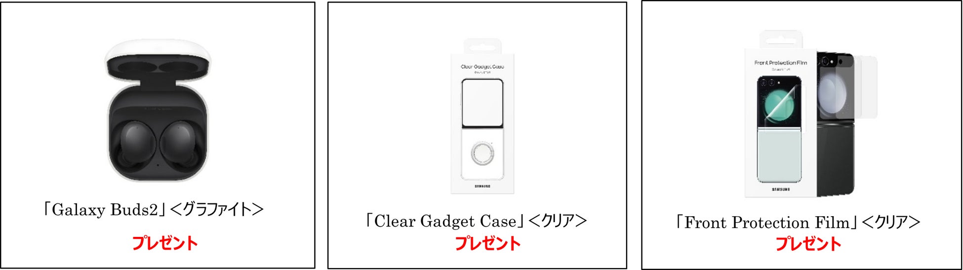 ※「Galaxy Z Flip5」SIMフリーモデル(512GB)をカートに追加いただくと自動で「Galaxy Buds2」<グラファイト>と「Clear Gadget Case」<クリア>と「Front Protection Film」<クリア>が追加されます。