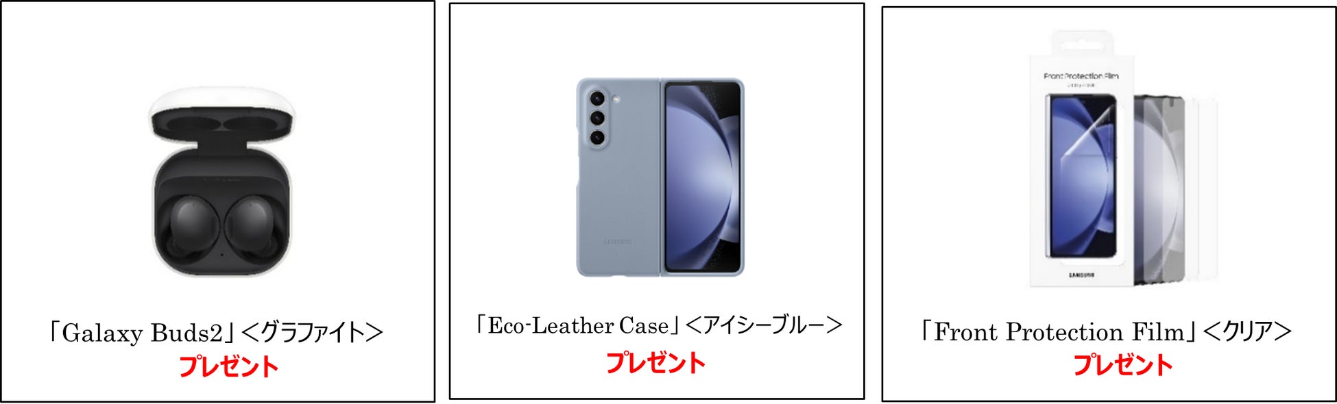 ※「Galaxy Z Fold5」SIMフリーモデル(1TB)をカートに追加いただくと自動で「Galaxy Buds2」<グラファイト>と「Eco-Leather Case」<アイシーブルー>と「Front Protection Film」<クリア>が追加されます。