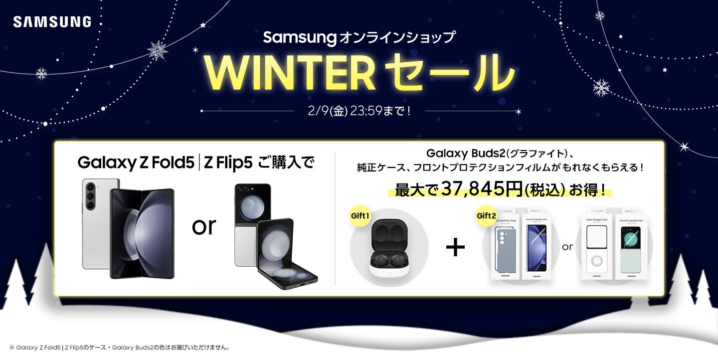 薄型・軽量化を実現しながらも没入感のある大画面を搭載し、パワフルなパフォーマンスを備えた横折り型スマートフォン「Galaxy Z Fold5」 SIMフリーモデル(1TB) または、利便性と自由自在な撮影機能を兼ね備えたファッショナブルな縦折り型スマートフォン「Galaxy Z Flip5」 SIMフリーモデル(512GB)を今回のWINTERセールでご購入いただくと、もれなく「Galaxy Buds2」+「純正ケース」+「フィルム」がもらえるキャンペーンも実施中です。