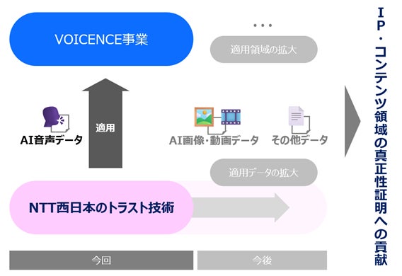本技術はNTT西日本が開始する音声AI事業「VOICENCE」に適用され、IPホルダーの生音声データ、AI合成モデルデータ、合成音声データ、及びそれらのトレーサビリティに活用されます。