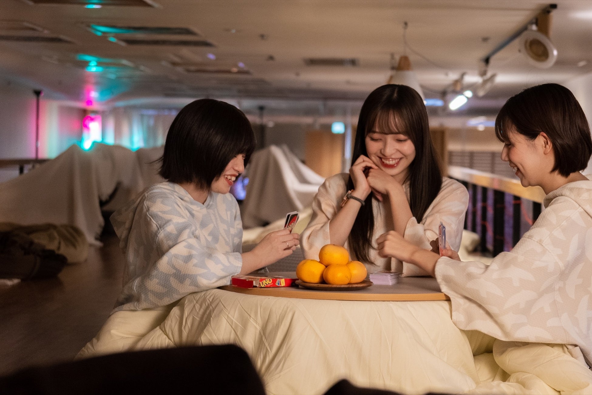 <ラウンジで>冬のおこもりにぴったりな「こたつ」や、本物の炎の暖炉を囲んで、思い思いの過ごし方を。カフェではホクホクのごちそうメニューに舌鼓!
