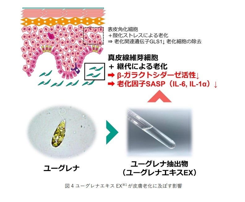 以上の結果より、ユーグレナエキスEX※1がヒトの真皮線維芽細胞※2の老化現象を抑制することが示唆されました(図4)。
