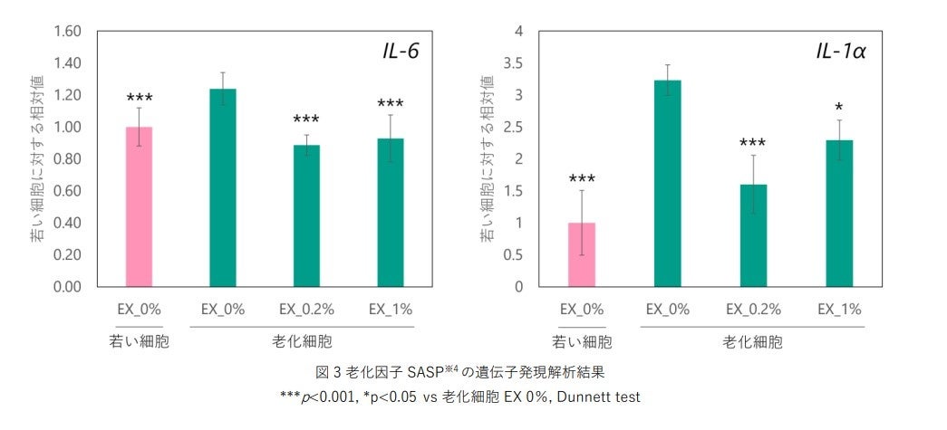 さらに、老化因子SASP※4の一種であるIL-6やIL-1αの遺伝子発現を調べたところ、若い細胞に比べて老化細胞(図3、老化細胞 EX 0%)では発現が増加しました。一方で、ユーグレナエキスEX※1の添加によって、未添加(図3、老化細胞 EX 0%)と比較してIL-6やIL-1αの遺伝子発現が減少することが確認されました(図3)。