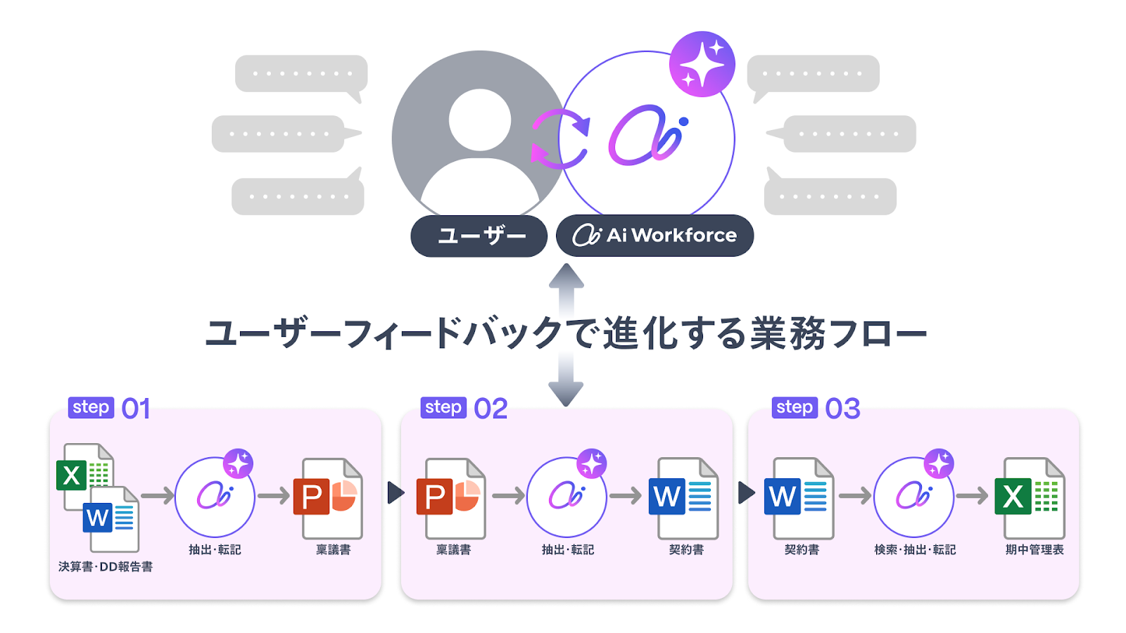 LayerXは、「企業と共に成長する」をコンセプトとしたAIプラットフォーム「Ai Workforce」を提供しています。これまで、エンタープライズ企業を中心に、「AIワークフロー」機能を活用し、企業ごとに異なる業務プロセスをAIに教えることで、営業・法務・人事・研究開発といった幅広い業務におけるドキュメントの管理・作成・レビューを支援してきました。