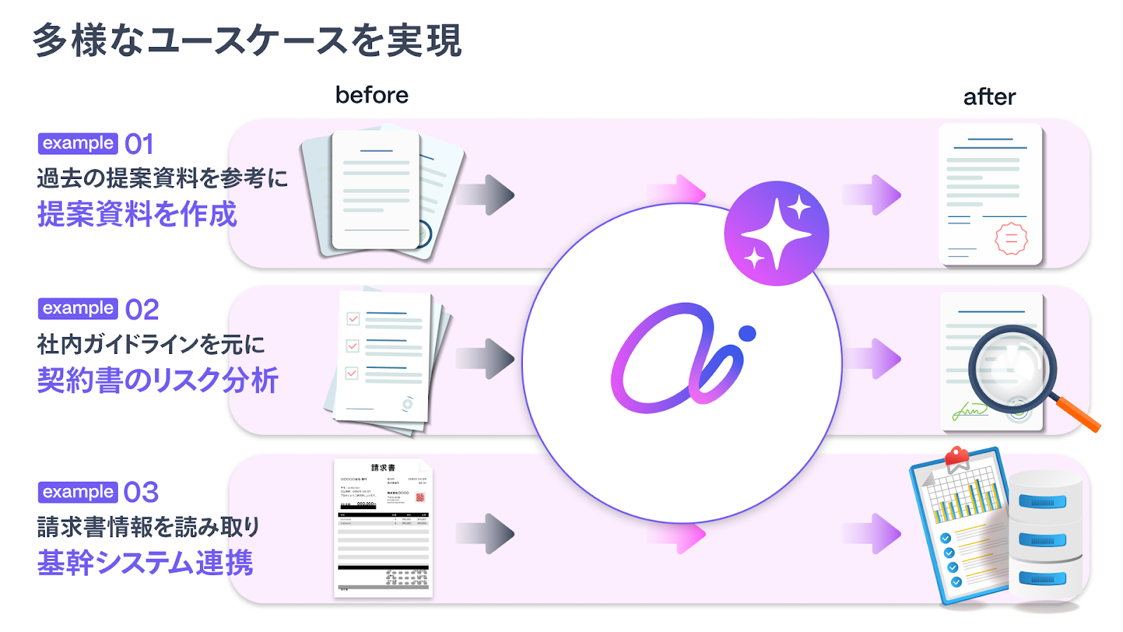 例えば、過去提案資料を参考にして提案資料を作成、社内ルール・ガイドラインを元にした契約書のリスク分析、請求書から情報を読み取って基幹システムに連携、といった多様なユースケースが実現できます。