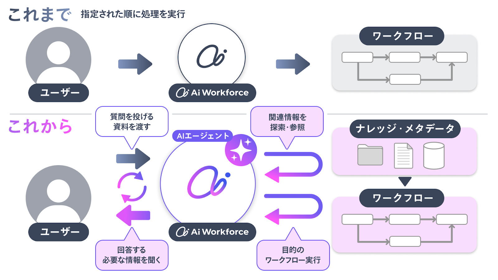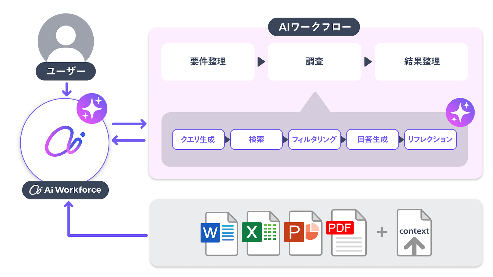 今回提供を開始する「Ai Workforce」の「AIエージェント基盤」では、自律的に判断・行動するエージェントと、安定的に処理を行うAIワークフローを組み合わせて定義・構築できます。これにより、ドキュメント検索や調査・レポート作成・資料生成をAIエージェントと対話的に進められるほか、連続的な一連の業務・タスクをシームレスに支援することが可能になります。