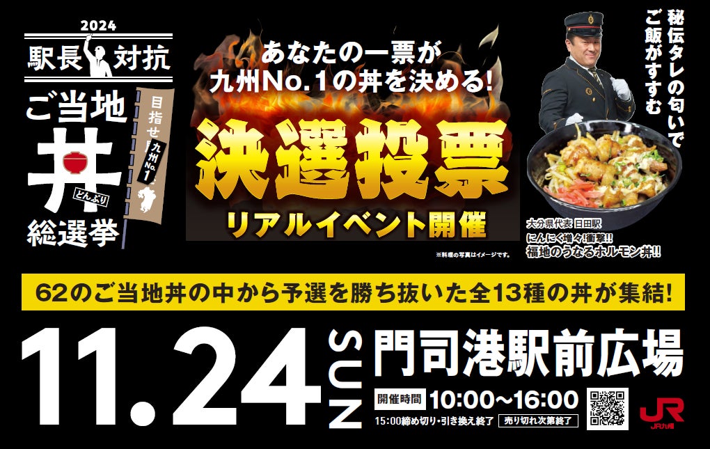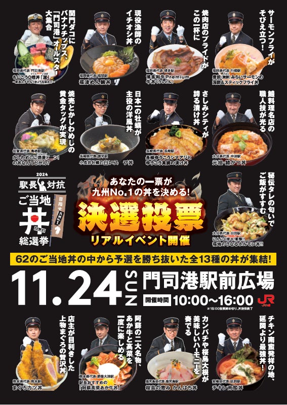 JR九州では駅周辺におけるにぎわいづくりや、地域と一体となって地域の魅力を発信するため、多くの素材を有する「九州の食」をテーマに『目指せ門司港!駅長対抗 ご当地丼総選挙』を開催しております。
