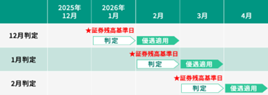 毎月の最終営業日時点の対象証券残高の合計(日本株・米国株・投資信託)を基準に翌々月のランクを決定し、優遇金利を適用します。