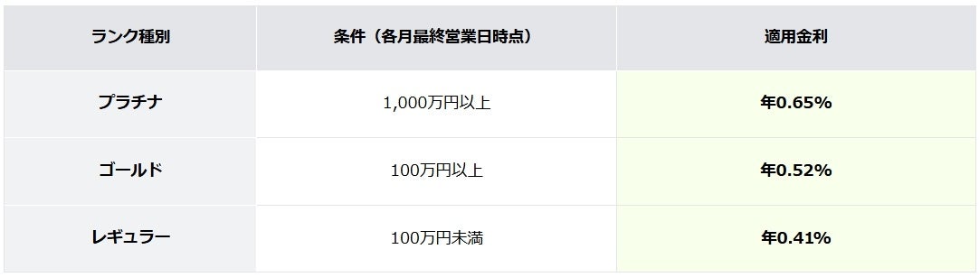 例:2025年12月30日時点の証券残高が1,000万円以上の場合、2026年2月から「プラチナ」ランクの年0.65%(税引後 年0.517%)が適用されます。