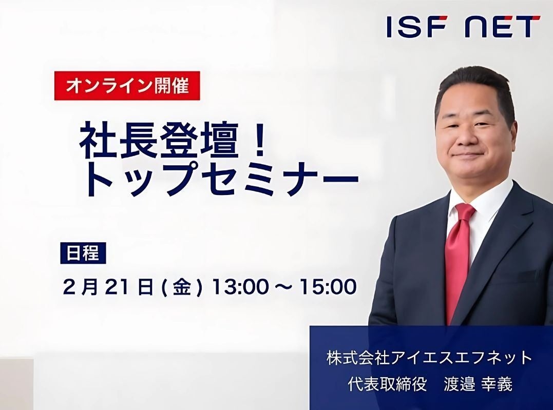 株式会社アイエスエフネット(本社:東京都港区/代表取締役:渡邉幸義、以下アイエスエフネット)は、2025年2月21日(金)に、26年卒向け「社長登壇!トップセミナー」を開催します。当日は代表の渡邉が登壇し、当社の魅力をお伝えします。