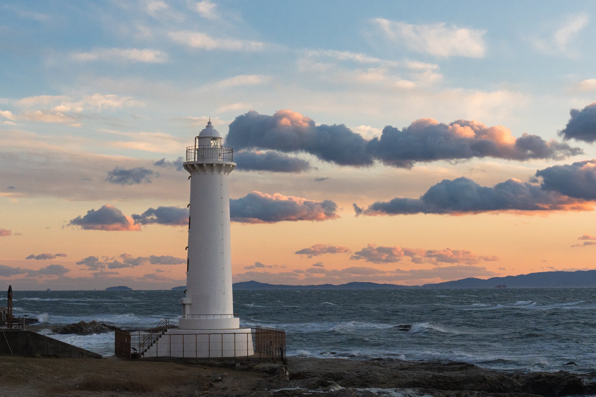 夕日と対極に白く聳え立つ灯台は『恋人達の聖地』と呼ばれ、ウエディングフォトや絆の鐘を鳴らされる観光客に人気のスポットです。