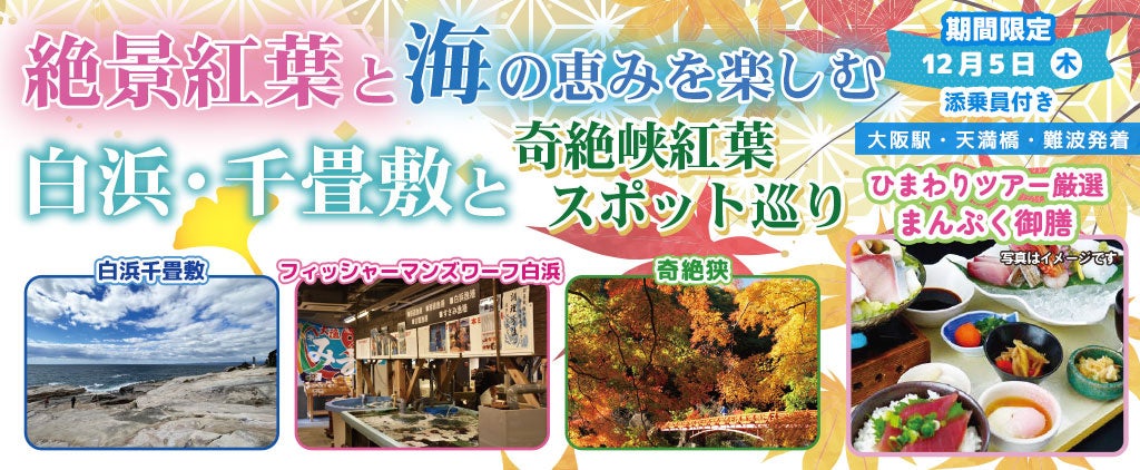 お一人様9,800円!〈大阪駅・天満橋・なんば発着〉12月5日(木) 絶景紅葉と海の恵みを楽しむ白浜・千畳敷と奇絶峡紅葉スポット巡り。〈添乗員付き〉日帰りバスツアーのオンライン販売を開始しました。