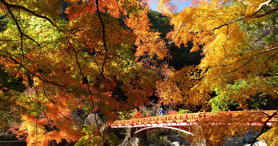 ④ 奇絶峡は田辺市の会津川の上流にある渓谷で、春の新緑や桜、夏の涼しげな川や滝、秋には紅葉と、四季折々の渓谷美をみることができます。