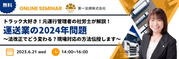 【2023年6月21日開催|無料セミナー】トラック大好き!元運行管理者の社労士が解説!運送業の2024年問題~法改正でどう変わる?現場対応の方法伝授します~