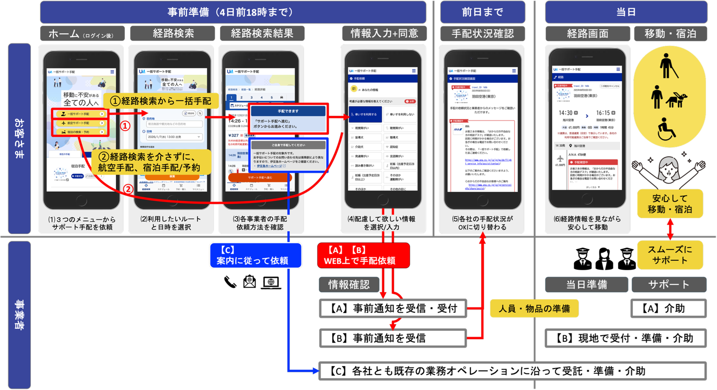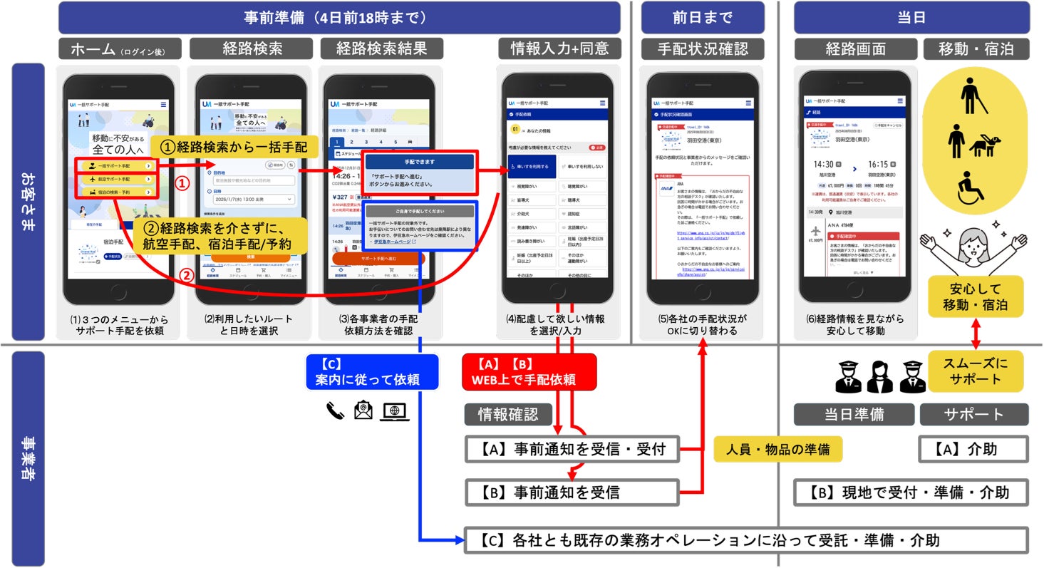 今回の実証実験では、航空、鉄道、バス、タクシー、宿泊施設との連携を強化し、お客さまの利便性向上を図ります。例えば、お客さまが各事業者に介助を依頼される際、これまでは事業者ごとに連絡先や依頼方法を調べ、個別に確認する必要がありました。今回の連携事業者拡大により、お客さまの確認作業の負担を軽減するとともに、各事業者においては、介助を必要とされるお客さまの効率的な情報収集が可能となります。