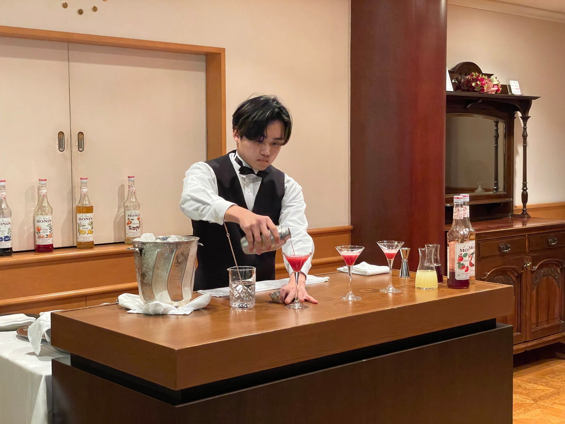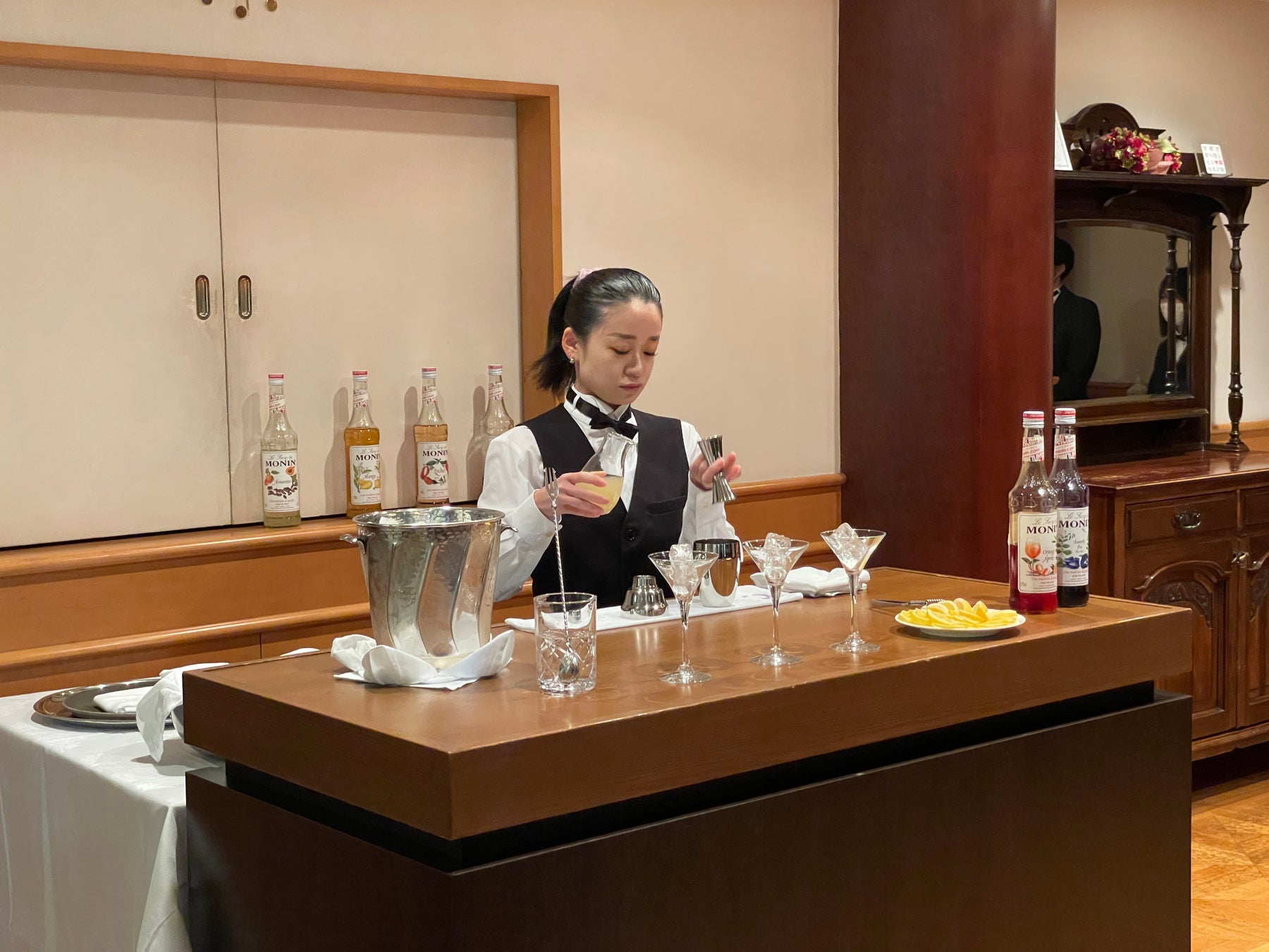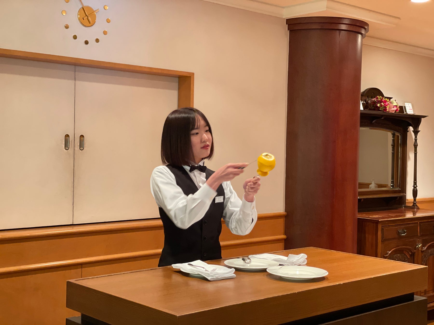 ①ホテル専門学生が2年間の集大成として、オリジナルカクテルを作成とフルーツカービングを披露しました。