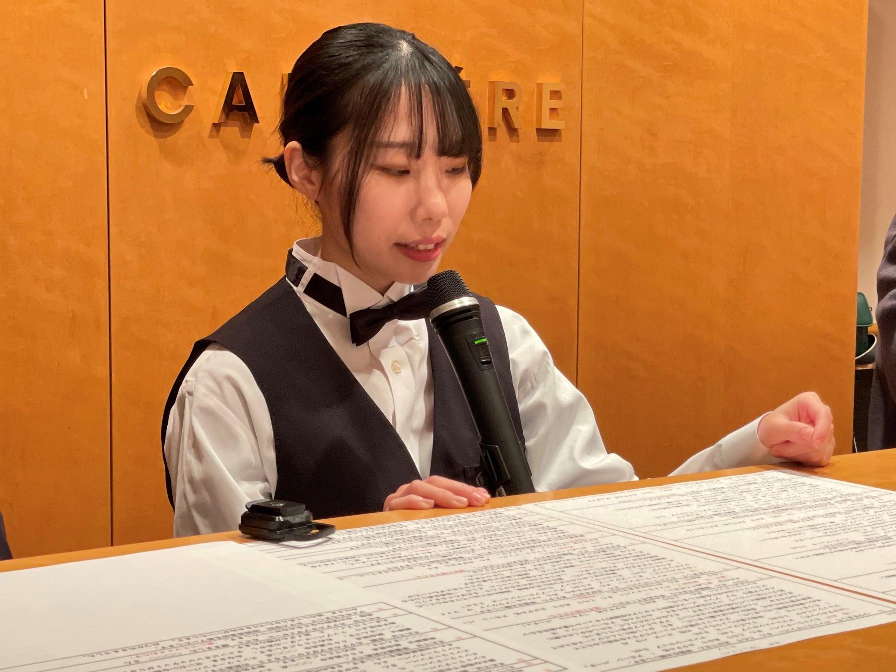 発表会には7名のホテル学科の学生が登場し、それぞれの力を発揮しました。司会進行・サービス・音響など全てを学生たちで担当し発表会を運営しました。客席にはオリジナルカクテルの試飲が用意され、会場全体でオリジナルカクテルを楽しみました。