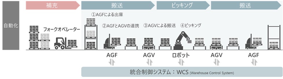 今回の共同実証は、従来から使われているAGF、AGV、ピッキングロボットの3つの機械の連動を最適化する点が特長となります。キリンビバレッジの倉庫オペレーション条件下で「ΣSynX」による最適化制御の検証を実施し、安全に配慮した倉庫物流現場の課題解決を目指します。