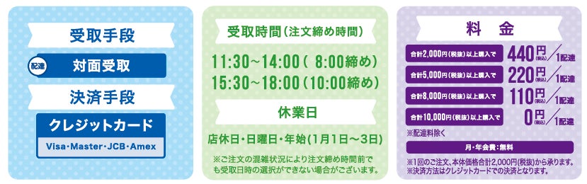 受け取り時間を指定できるため、仕事や育児、介護や天候の悪い日など、店舗に立ち寄ることや時間がないときにも簡単で便利なサービスです。月会費・年会費も無いため、サービス登録いただくことでいつでも気軽に利用できます。