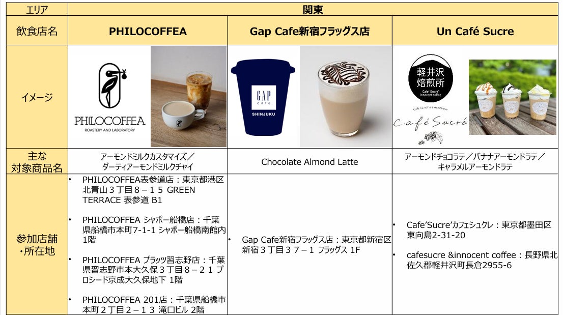 各店舗でアーモンド効果<For Barista and Chef>」を使用したドリンクメニューが特別価格でお楽しみいただけます。