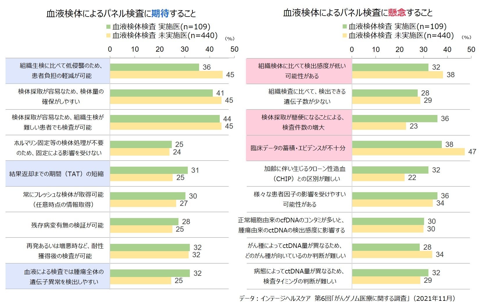 - 血液による検査を実施している医師の36%が「検査件数の増大」を懸念し、実施していない医師と比較すると13ポイント上回る。実施医は検査内容やその後の治療までの流れを把握した上で、より具体的な期待や懸念を抱いている