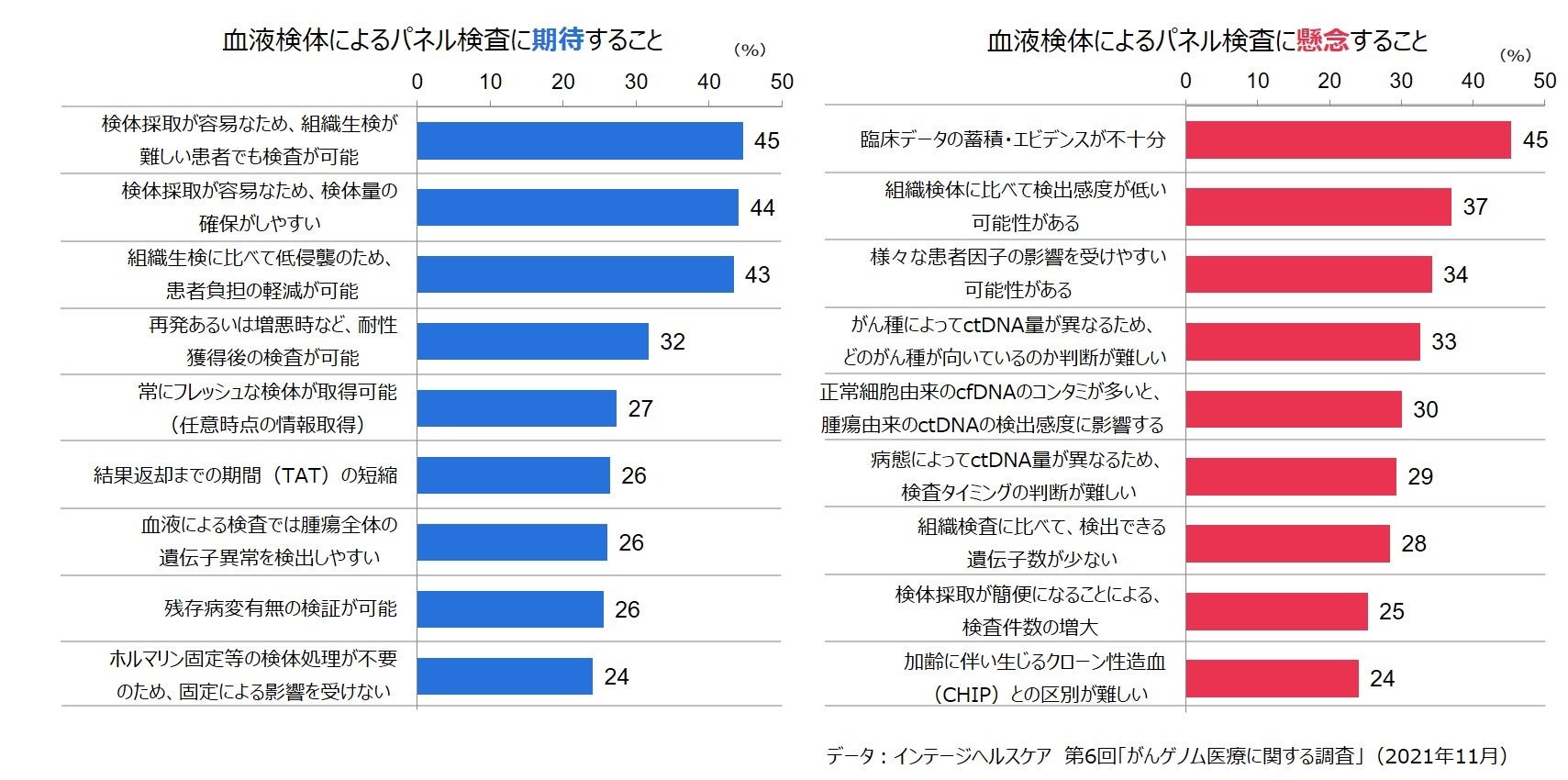 - 血液による検査に期待することとして、45%の医師が「検体採取が容易で、組織の採取が難しい患者も検査可能」、43%が「低侵襲性(患者の負担が少ないこと)」と回答。一方、45%の医師は「臨床データやエビデンス不足」を懸念と感じている