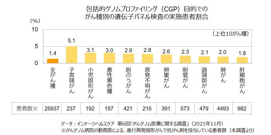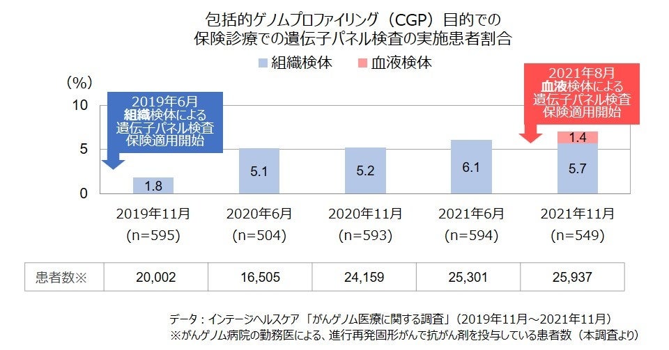 - 包括的ゲノムプロファイリング(CGP)(※2)を目的とした遺伝子パネル検査を実施した患者の割合がゆるやかな増加傾向にある中、今回初めて聴取した「血液による検査」の実施割合は1.4%